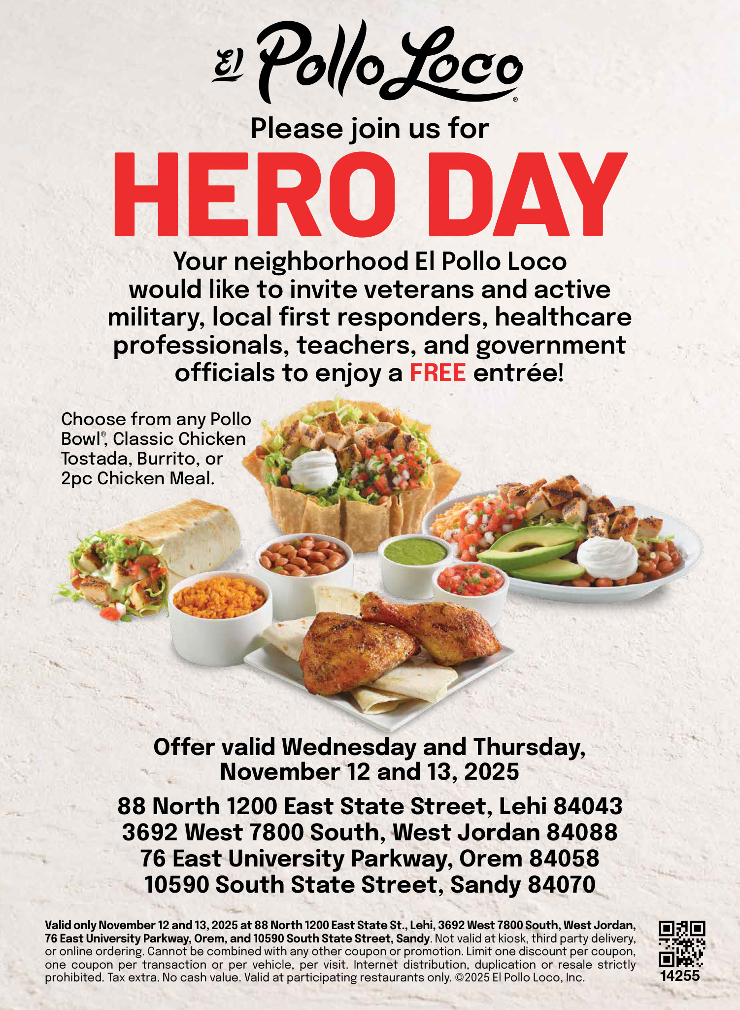 Participating heroes can indulge in some of our fan-favorite entrées, including the Pollo Bowl, Classic Chicken Tostada, Burrito, or 2pc Chicken Meal. This exclusive offer will be available at select Utah locations, all day long: