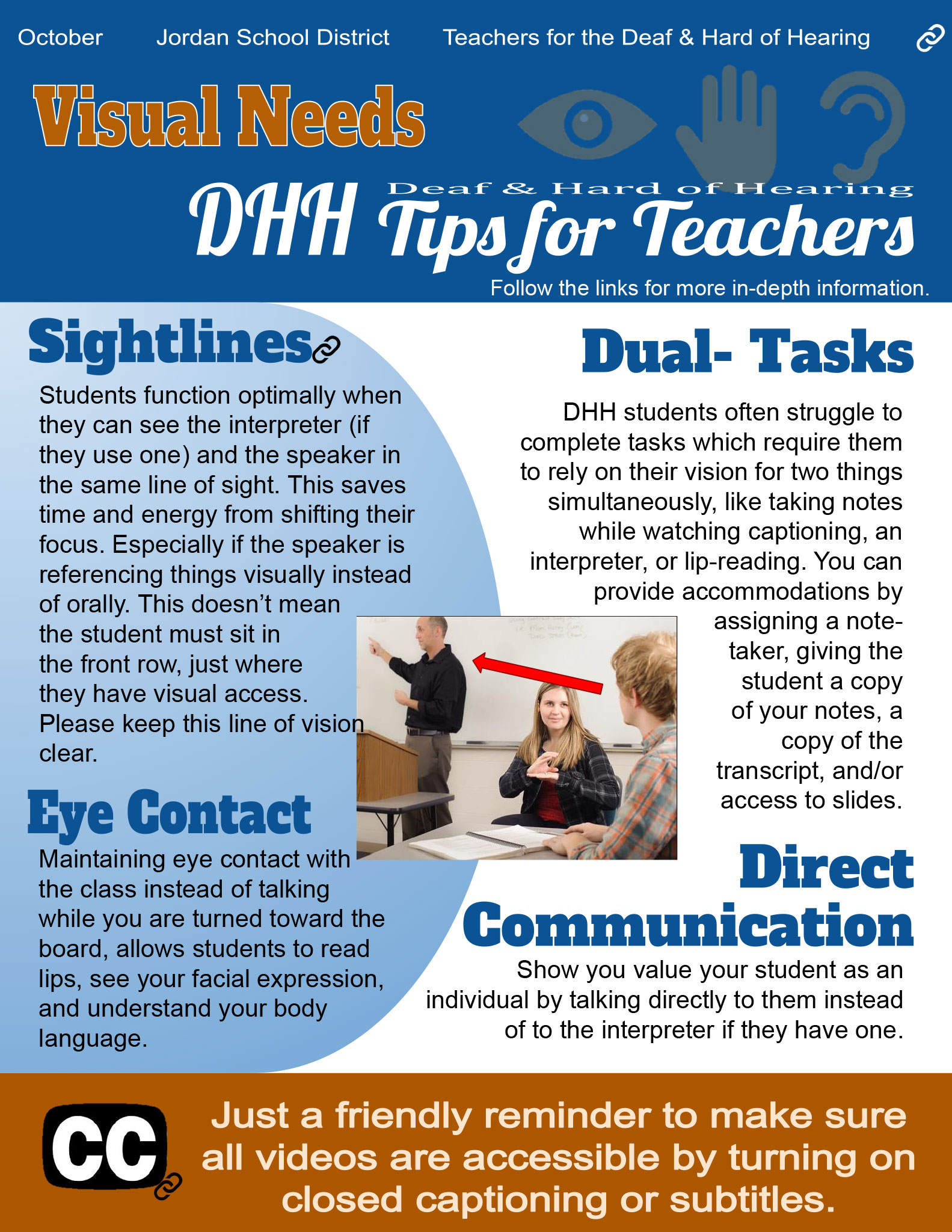 Dual-Tasks - DHH students often struggle to complete tasks which require them to rely on their vision for two things simultaneously, like taking notes while watching captioning, an interpreter, or lip-reading. You can provide accommodations by assigning a notetaker, giving the student a copy of your notes, a copy of the transcript, and/or access to slides.
