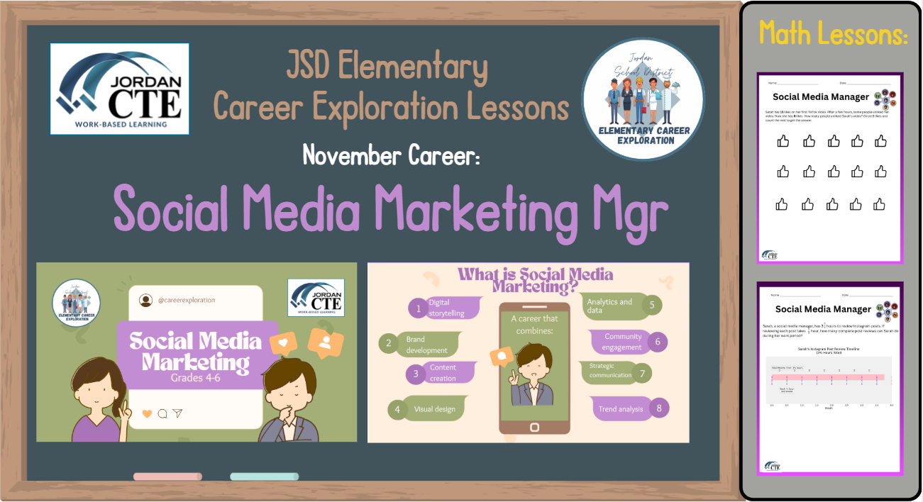 You can find this month's CTE Career Exploration lesson and math worksheets, and all future ones, by visiting the Elementary Career Exploration Lessons page at cte.jordandistrict.org.